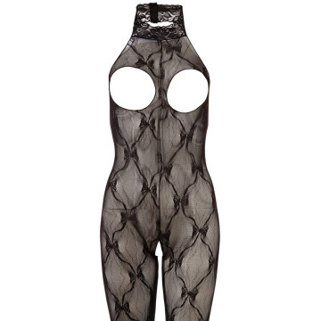 Un vestito da seduzione emozionante! Tuta senza busto in pizzo ad effetto coccoloso con collo alto apribile con una chiusura a velcro. Senza schienale e con una stuzzicante apertura sul cavallo. Con piede. Nero. 100% poliammide.