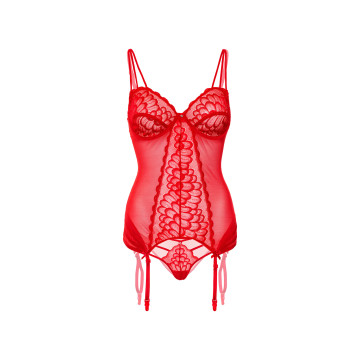 Mescola e abbina il corsetto in pizzo con perizoma. Bella giarrettiera con corsetto in pizzo, presenta pizzo di lusso, cinturini decorativi sul davanti, dettaglio di diamanti, schiena aperta, spalline regolabili, chiusure a gancio 3x2 sul retro e perizoma abbinato.