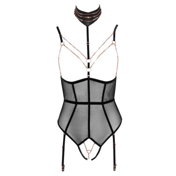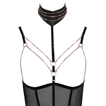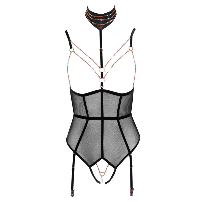 Elegante e invitantemente rivelatore! Body senza seno di Abierta Fina con cavallo completamente aperto in powernet con strisce di velluto elastico ed elementi di gioielleria color oro rosa. Cinghie e bretelle regolabili, bretelle anche rimovibili. Cinghia regolabile del décolleté con collana ornata di catene (con chiusura a bottone) anch'essa rimovibile, così come le catene del seno con piccoli moschettoni e la catena inguinale con anello decorativo. Tutte le catene sono inoltre decorate con piccoli strass. Vista posteriore in look a due pezzi con due chiusure a clip su reggiseno e mutandine/cintura in vita. 90% poliammide, 10% spandex. Senza calze.