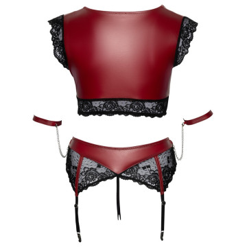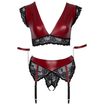 Bralette, perizoma con reggicalze ouvert e 2 polsini per le braccia in un set di Cottelli BONDAGE PLUS in un elegante look rosso opaco con fine pizzo nero elastico e dettagli in metallo color argento. La bralette scollata copre in modo seducente la parte superiore della schiena e le spalle. Il perizoma a vita alta è dotato di reggicalze cuciti strettamente e regolabili in lunghezza. Su ogni lato sono fissati degli anelli ai quali si possono agganciare i due polsini delle braccia con le loro catene a moschettone. Le cavigliere possono essere indossate rapidamente con le loro chiusure in velcro e regolate per adattarsi. Il cavallo del tanga è aperto.
