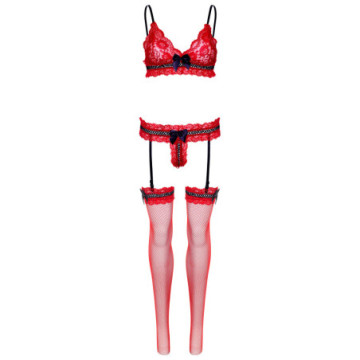 Set reggiseno e slip con balza in pizzo 3 pezzi con spalline regolabili, dettagli a rete e fiocco e calze a rete abbinate.