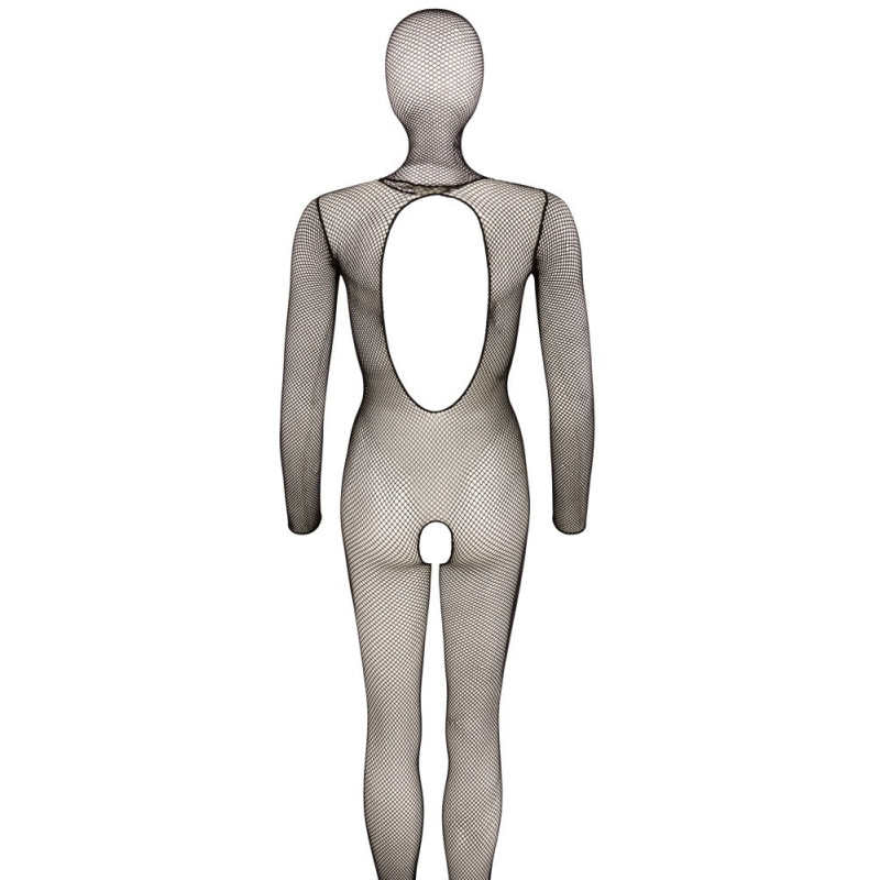 Catsuit ouvert altamente elastico con maschera per la testa senza occhi e narici. Solo la bocca rimane libera. Realizzato in materiale a maglia fine, con piede e scollatura tonda nella parte posteriore.