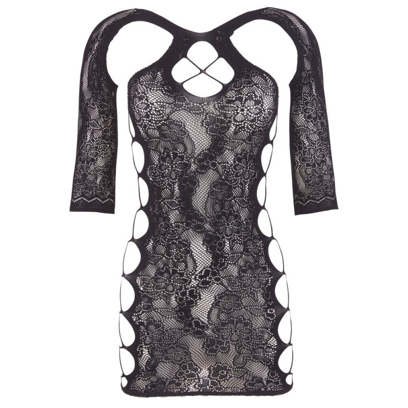Bellissimo abitino in tessuto basato su rete con rifinture in pizzo nero florelae. Ai due lati è completamente aperto e coperto dalla sola stringa incrociata. Ideale nelle serate glamour o da indossare sotto ad un copri abito.