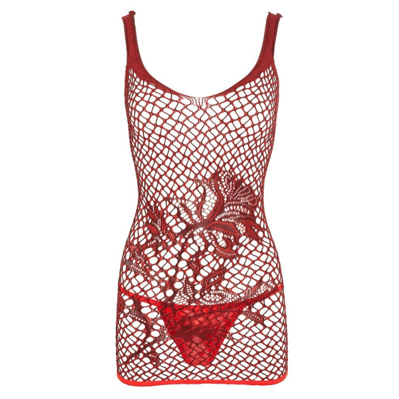 Sexy Abitino rosso a rete in pizzo. Elegante la finitura floreale davanti. Sul retro presenta un' ampia apertura al centro della schiena. Elasticizzato alla perfezione per essere indossato davvero con aderenza e comodità .
