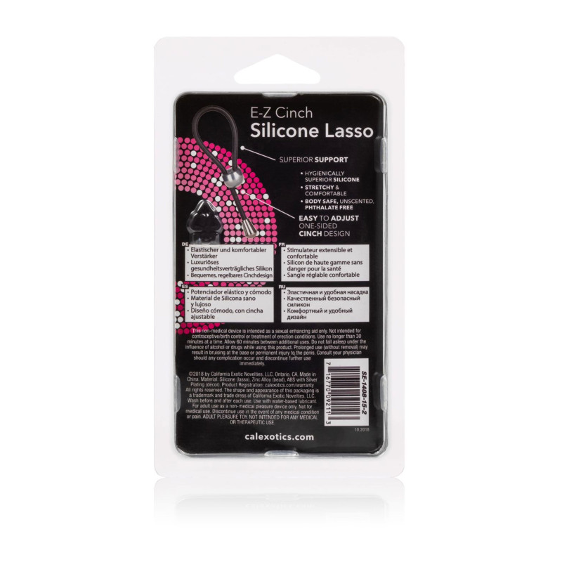 Migliora il tuo strumento di piacere e goditi la stimolazione avventurosa con l'anello Lasso al silicone EZ Cinch. Il cinch facile da usare è realizzato con un anello lazo elastico e un tallone di serraggio unico per una comoda presa con una sola mano. L'anello di piacere funziona per massimizzare il piacere e aumentare la circonferenza per rendere la ricreazione un'esperienza orgasmica per ogni coppia. Goditi il piacere più potente e aumenta la resistenza aumentando il flusso di sangue verso il tuo strumento di piacere con la presa in giro. Il materiale ipoallergenico si accoppia perfettamente con qualsiasi lubrificante a base d'acqua.