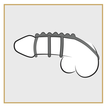 Quartetto di anelli del pene, collegati con una barra di stimolo frastagliata. Spessore dell'anello 8 mm ciascuno. Anello Ø 3 x 2,3 cm e 1 x 4,3 cm. Lunghezza totale 6,5 cm. Nero fumo. Materiale: TPE.