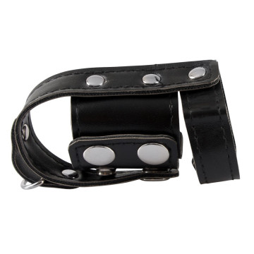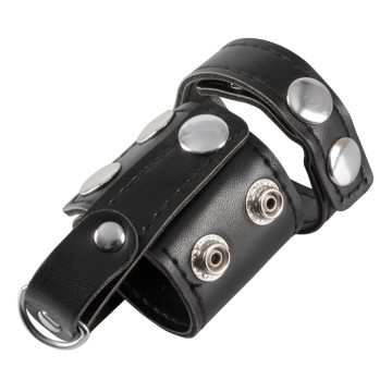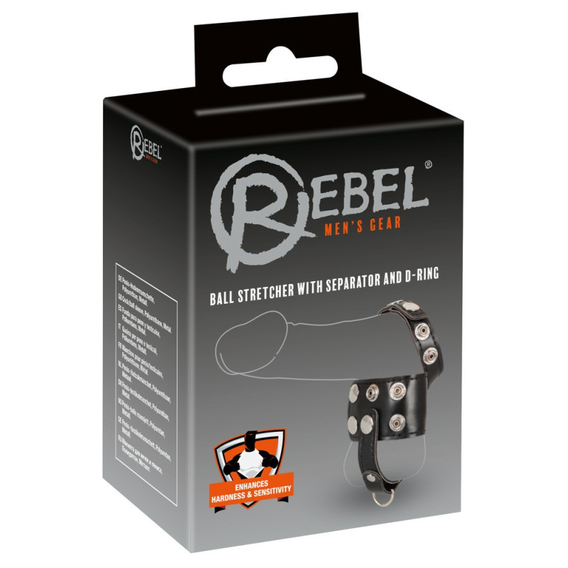 Cinghia per pene e testicoli con divisore per testicoli in pelle maschile. Con anello a D sul divisorio dei testicoli per attaccare dei pesi (non inclusi) o un guinzaglio guida (non incluso). Tutte le cinghie e il divisorio sono regolabili con bottoni a pressione per una perfetta vestibilità.