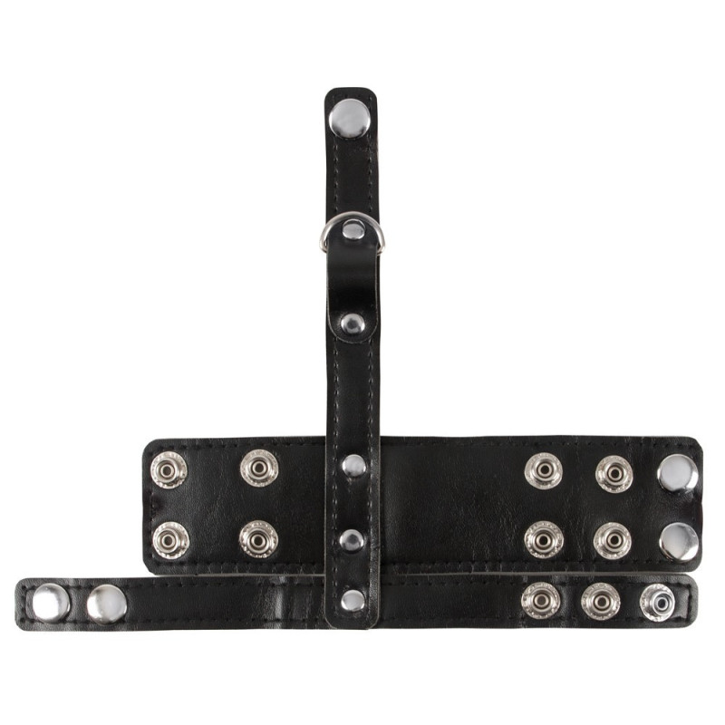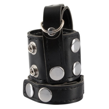 Cinghia per pene e testicoli con divisore per testicoli in pelle maschile. Con anello a D sul divisorio dei testicoli per attaccare dei pesi (non inclusi) o un guinzaglio guida (non incluso). Tutte le cinghie e il divisorio sono regolabili con bottoni a pressione per una perfetta vestibilità.