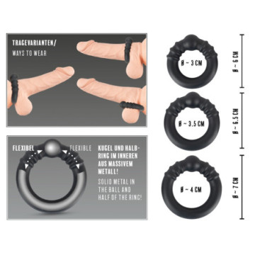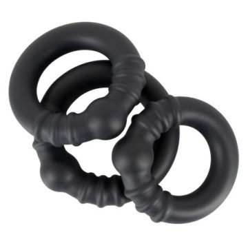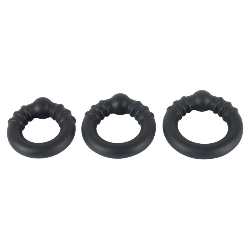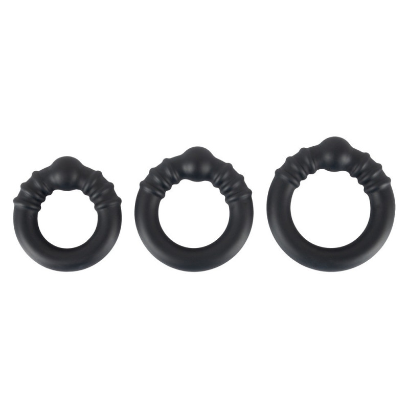 3 anelli per il pene in un set. Ogni anello è fatto di silicone morbido e setoso con un anello di metallo aperto all'interno. Questo rende l'intero anello leggermente elastico, facile da infilare e togliere, e abbraccia strettamente il pene per quell'effetto di stimolazione dell'erezione. La struttura di stimolazione sferica a coste fornisce una stimolazione aggiuntiva e una tenuta salda - anche di un preservativo.