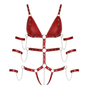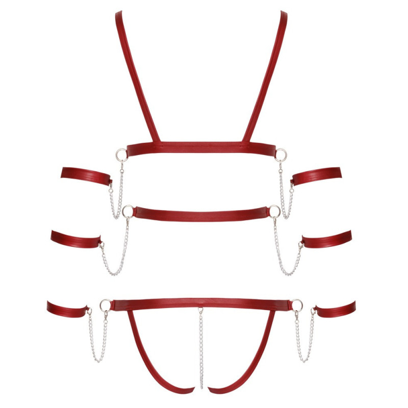 Stravagante body crotchless di Bad Kitty in look bondage, realizzato con morbide cinghie elastiche in un sofisticato look rosso scuro opaco. Con coppe apribili (bottoni a pressione) e catena a moschettone staccabile nel cavallo aperto. Cinghie regolabili e cinghie con bottoni a pressione. 6 cavigliere per mani/braccia con catene a moschettone - staccabili dagli anelli ai lati del corpo. Cinturini stretti alla caviglia con chiusure in velcro regolabili.