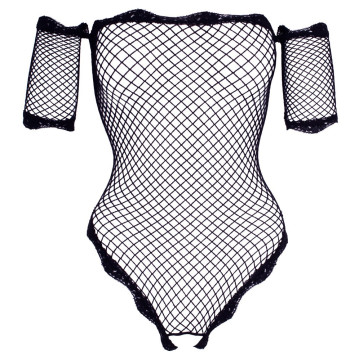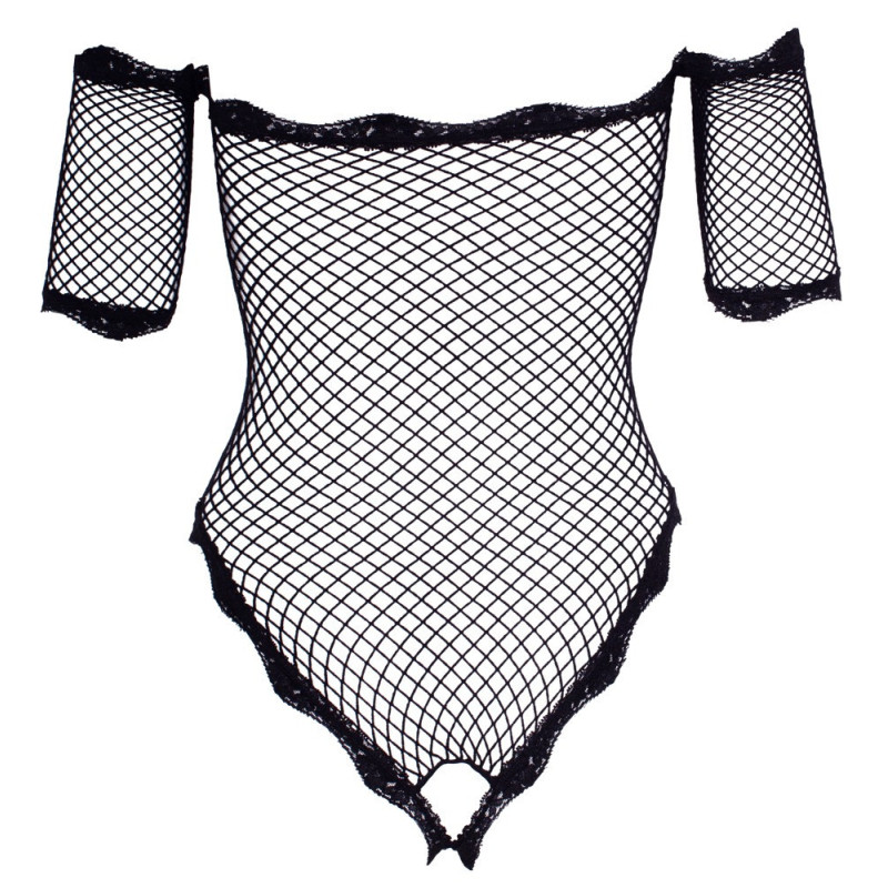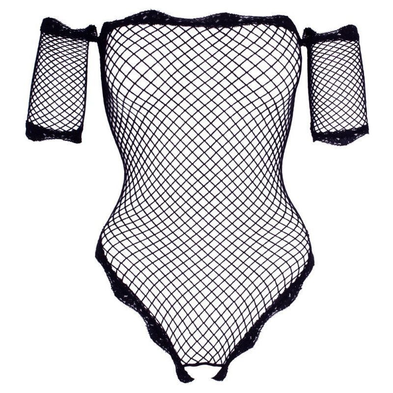 Body trasparente senza cavallo realizzato in morbida rete elastica con braccio corto cucito. Con scollo a spalla senza spalline ed eleganti finiture in pizzo sulla scollatura, sulle braccia e sulle gambe.