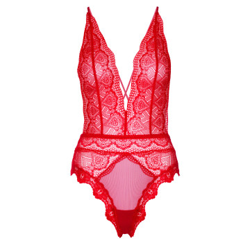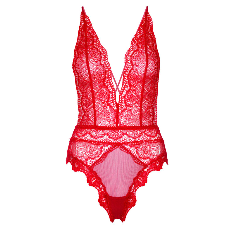 Orsacchiotto in pizzo a V profonda - Orsacchiotto con scollo profondo in pizzo delicato con motivo a cuore e rete trasparente. Schiena bassa con spalline sottili incrociate e buco della serratura sfacciato.