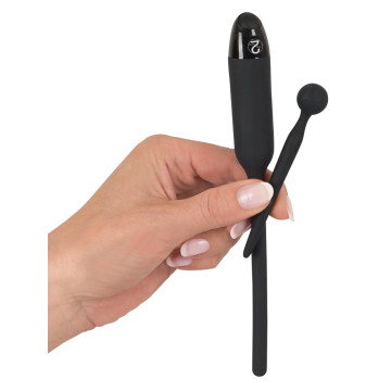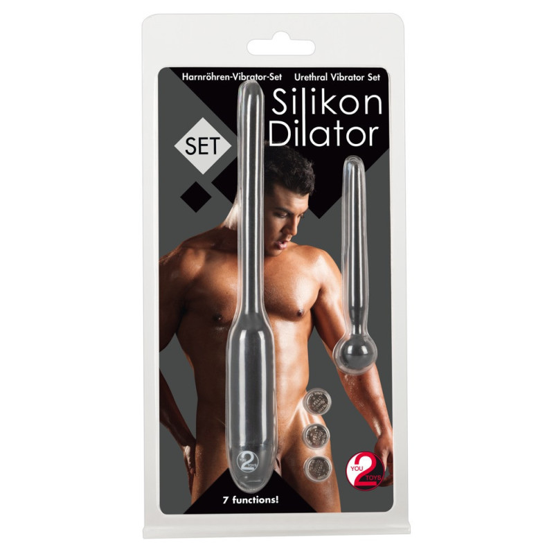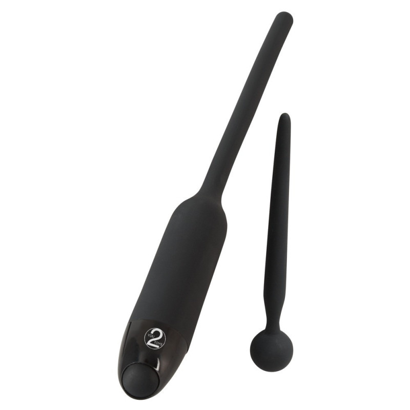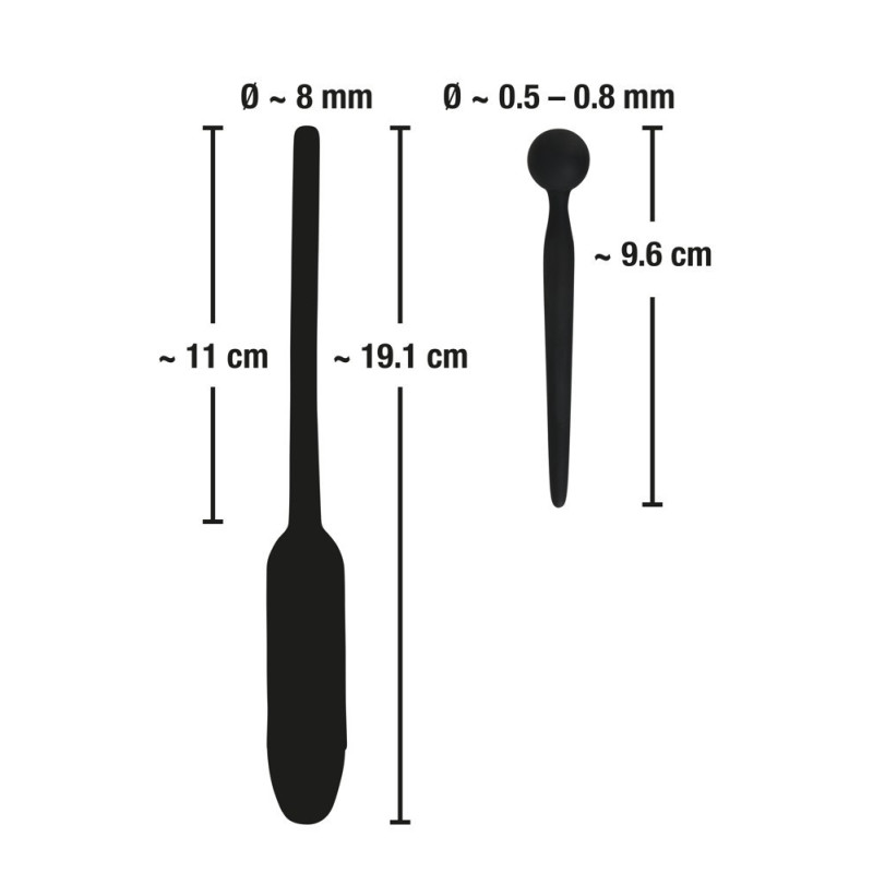 Piaceri uretrali CON e SENZA vibrazioni! Dilatatore vibratore più spina del pene in un set. Tutti completamente senza cuciture e fatti del miglior silicone per giocare e indossare senza preoccupazioni. Vibratore dilatatore con 7 modalità di vibrazione al tocco di un pulsante. Tappo affusolato per il pene con tappo. Batterie incluse (3 x LR44). Vibratore dilatatore: lunghezza totale 19,1 cm, lunghezza d'inserimento 11 cm, Ø 0,8 cm, peso 34 g; plug per il pene: lunghezza totale 9,6 cm, lunghezza d'inserimento 8 cm, Ø 0,5 cm a 0,8 cm, tappo Ø 1,6 cm, peso 6 g. Silicone, PU, ABS.