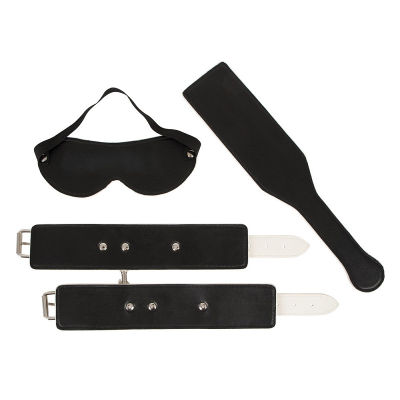Set fetish di alta qualità composto da maschera per gli occhi, manette e paddle in pelle nobile con dettagli fluorescenti che brillano al buio! Maschera opaca per gli occhi su un'ampia fascia elastica per la testa. Manette con chiusura a fibbia regolabile (circonferenza da 18 cm a 28 cm). Paletta battente lunga 31 cm.