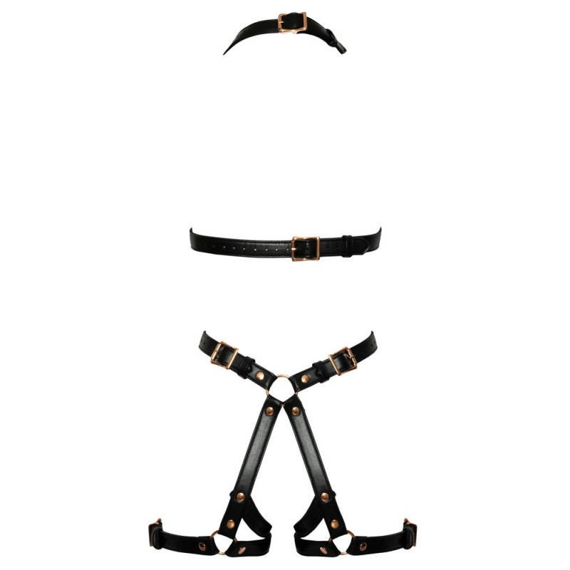 Accattivante costume intero dal look nobile! Imbracatura di Bad Kitty in pelle con dettagli in metallo color oro rosa. Il costume intero senza seno ha un collo a balestra, un invitante cavallo aperto e cinghie sulle cosce. Le cinghie in morbida similpelle vegana possono essere regolate più volte con le fibbie per una vestibilità perfetta. Poliuretano (a base d'acqua), metallo.
