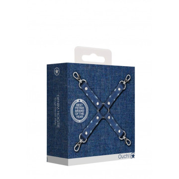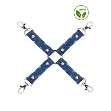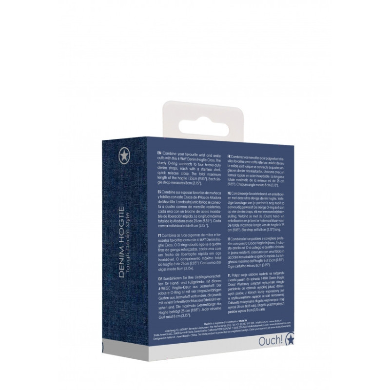 Combina le tue polsiere e cavigliere preferite con questa Croce Hogtie in jeans. La costrizione totale del corpo non è mai stata così semplice, lega le braccia e le gambe dietro alla schiena, o davanti, per un controllo e una sottomissione totale! Questa Hogtie in Jeans sarà assolutamente fantastica in qualsiasi collezione BDSM, sia di principianti che di giocatori esperti! Il robusto anello ad O si collega a quattro cinturini in jeans resistenti, ciascuno con una fibbia in acciaio inossidabile a sgancio rapido. Basta agganciarli alle polsiere e alle cavigliere (Ouch) e sei pronto per giocare. Questo robusto tessuto si fonde perfettamente con qualsiasi cosa indossi durante il tuo gioco di ruolo stravagante! Il popolare mondo di Ouch! Denim terrà il tuo sottomesso al sicuro e lo farà apparire stupendo! La lunghezza massima dell'hogtie è di 25cm (9.85"). Ogni cinturino misura 8cm (3.15").