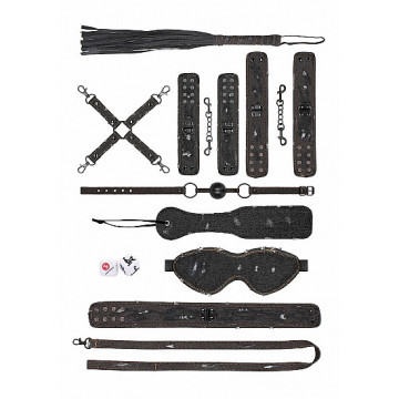 Il kit è composto da : manette da polso e da caviglia, mascherina per gli occhi, bavaglio a palla traspirante, collare con guinzaglio, paletta, flogger, pugnale e dadi.