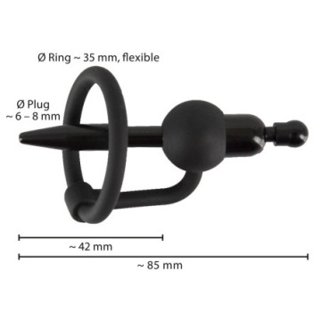 Lunghezza totale 8,5 cm. Lunghezza d'inserimento 4,2 cm. Ø da 0,6 cm a 0,8 cm. Anello Ø 3,5 cm, espandibile. Peso 14 g. Silicone, PU, ABS.