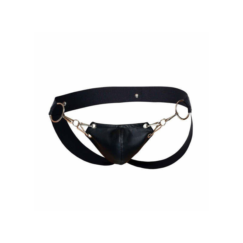 Il sospensorio a scatto è realizzato in resistente ecopelle in nero lucido. Con una copertura minima sul retro, il sudore può evaporare più liberamente offrendo a chi lo indossa una vestibilità più confortevole. Una custodia a catena nella parte anteriore sostiene il pene senza lesinare sul sex appeal, mentre le cinghie larghe si trovano sui fianchi per una finitura di supporto.