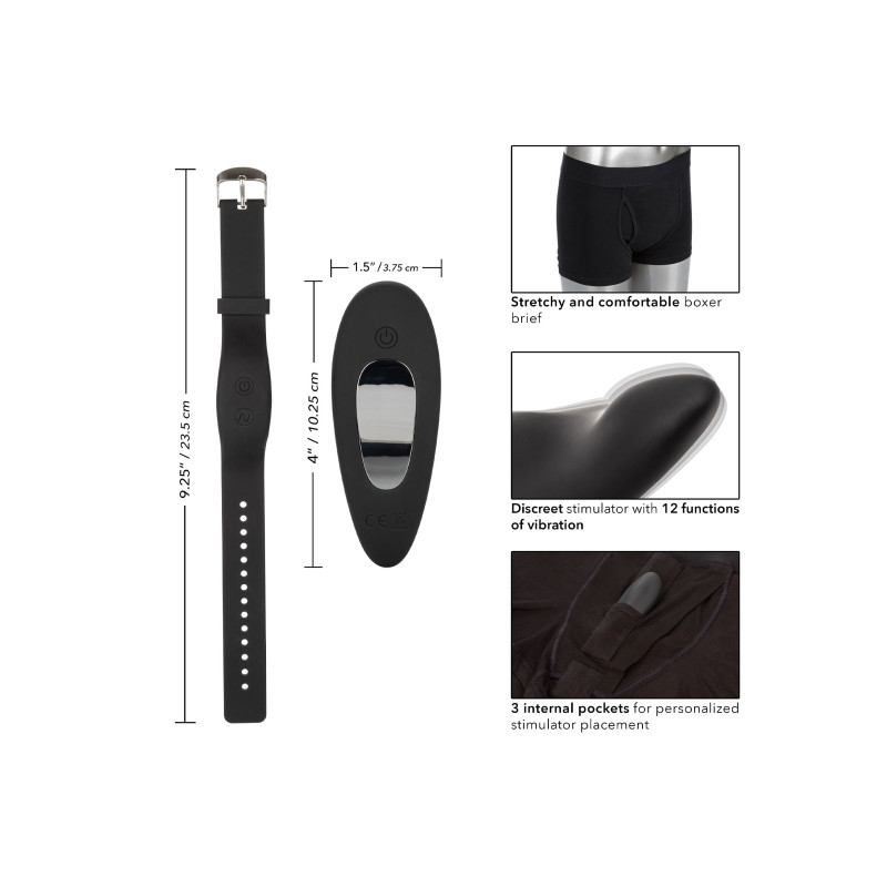 Il Boxer Brief Set con telecomando è fatto per avventurosi cercatori di piacere, con un boxer extra comodo abbinato a un potente mini vibratore e un discreto controller da polso. L'elegante, ma discreto controller del braccialetto rende facile per te o il tuo amante controllare l'intensità della vibrazione con il semplice tocco di un pulsante. Ogni volta che o ovunque ti porti la passione, il raggio di 32 piedi di questo appassionato mini vibratore e 12 intense funzioni di vibrazione sono pronte per il gioco. I boxer discreti e aderenti hanno 3 tasche interne per stimolatori per un posizionamento personalizzato dello stimolatore.