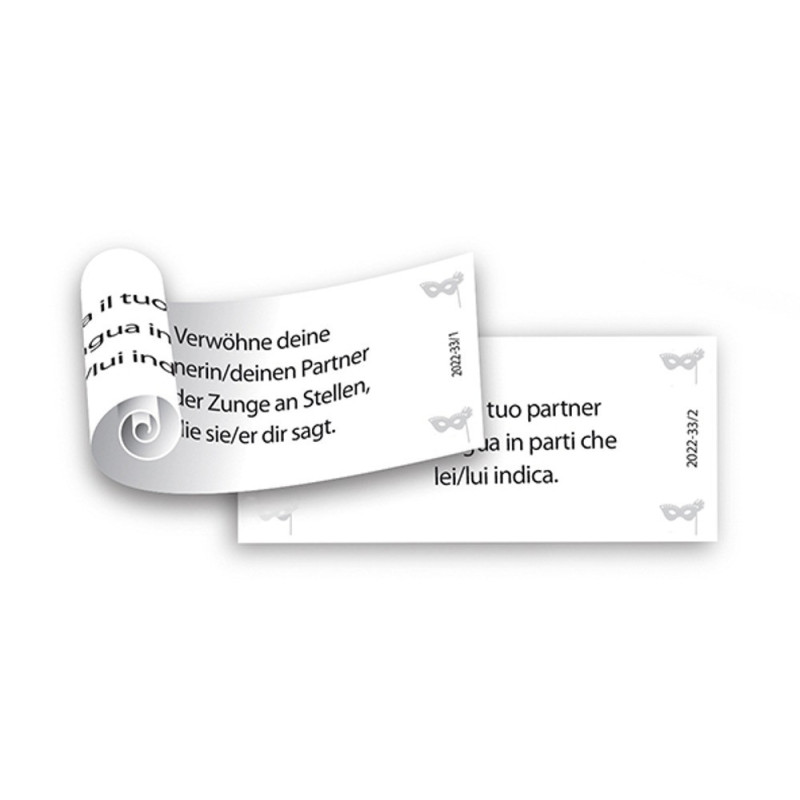 Gioco erotico per coppie in una bellissima scatola a cuore 100 fogli di carta con compiti sensuali La carta può essere rimossa con le pinzette incluse In tedesco e italiano Divertiti con un partner con compiti erotici! Un gioco per due emozionante e sensuale. LUI o LEI usa le pinzette per estrarre uno dei 100 fogli di carta arrotolati che si trovano all'interno della scatola a forma di cuore. C'è un compito, un suggerimento o una sfida sui pezzi di carta che i giocatori devono poi svolgere. Il gioco è perfetto per gli innamorati e le coppie che vogliono scoprire la loro passione in un modo nuovo o un fantastico regalo di San Valentino / anniversario. In tedesco e italiano.
