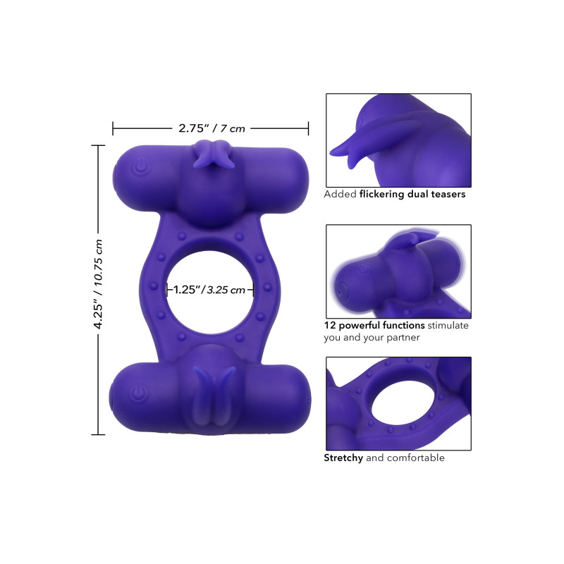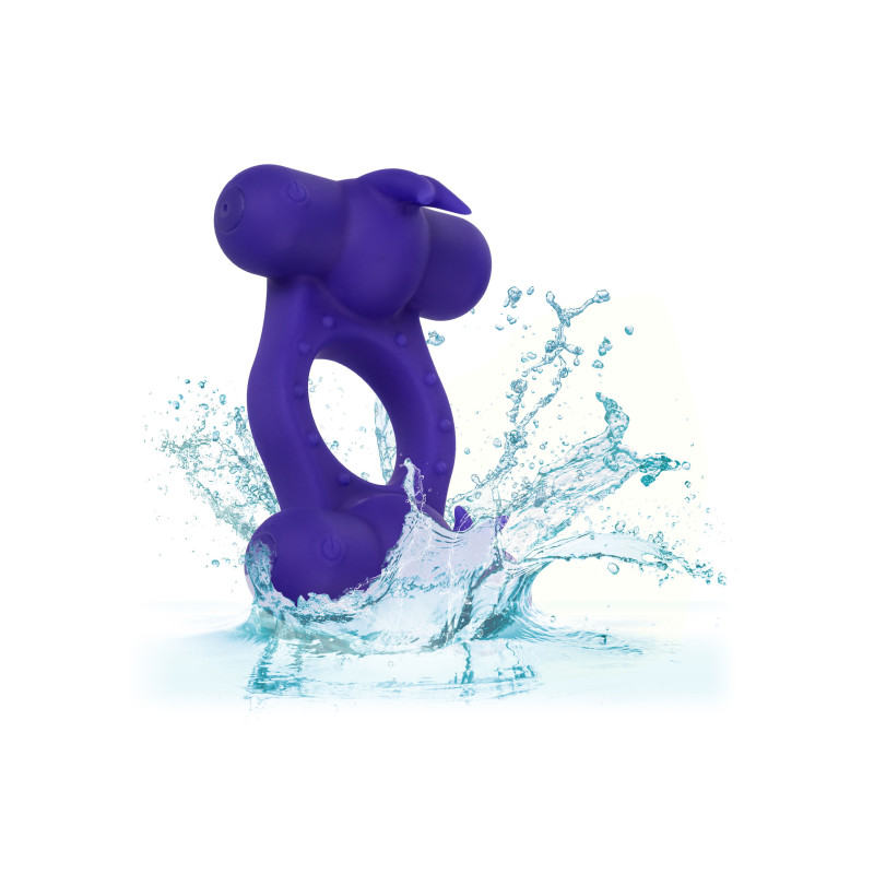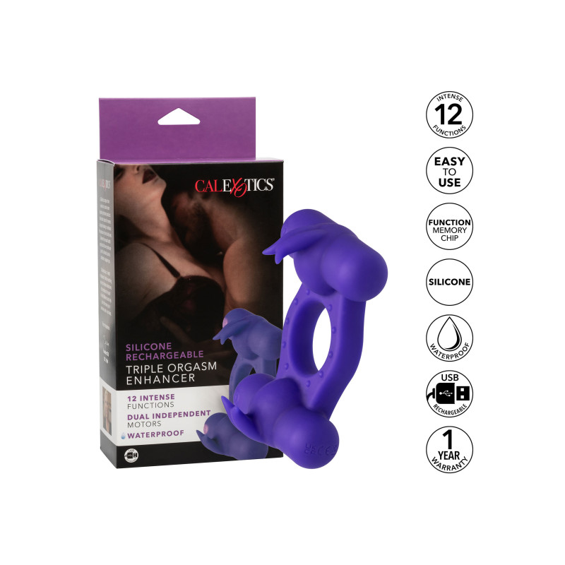 Massimizzate il vostro piacere quando vi infilate nel Triplo Orgasm Enhancer ricaricabile in silicone. Mentre l'anello elasticizzato si mantiene stretto, gli eccitanti doppi stuzzicanti offrono una stimolazione a contatto completo di più zone del piacere. L'anello in silicone morbido e sicuro per il corpo migliora la resistenza e la circonferenza per far gemere il vostro amante per avere di più, di più, di più. L'anello stretto ed elastico massimizza la sensibilità e aumenta le sensazioni in tutto il corpo, permettendovi di godere di un piacere più lungo e potente. Raggiungete un piacere di livello superiore con 12 funzioni di vibrazione e doppio rabbit teaser per lasciare entrambi i partner in uno stato di beatitudine orgasmica. I due rabbit teaser tremolanti eccitano con vibrazioni profonde e rimbombanti da due potenti motori. Portate questo anello impermeabile a fare un tuffo e abbracciate le potenti vibrazioni ovunque vogliate bagnarvi. Questo appassionato cock ring ricorda esattamente come vi piace grazie a un chip di memoria all'avanguardia, in grado di riconoscere l'ultima funzione utilizzata. Ricaricate il vostro piacere in un attimo con un tempo di ricarica di 1,5 ore e godetevi fino a 80 minuti di gioco.