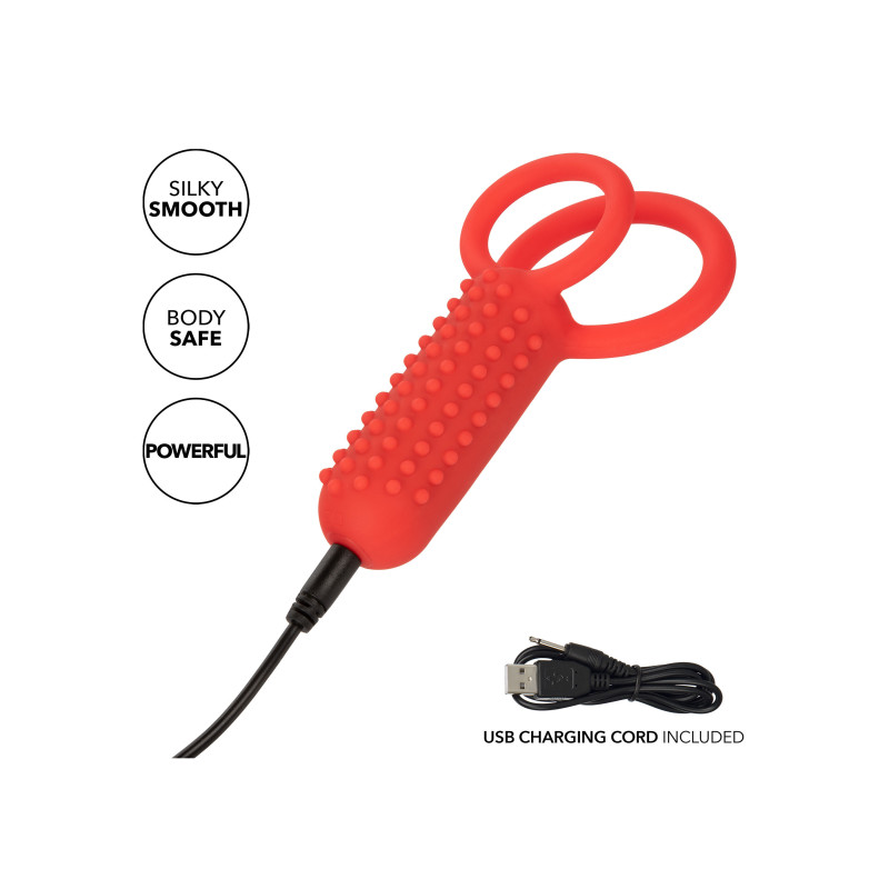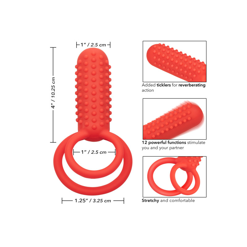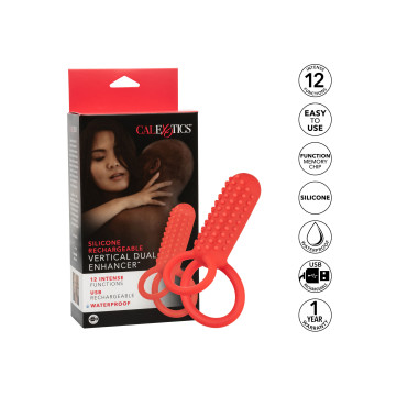 Il CalExotics Silicone Rechargeable Vertical Dual Enhancer combina 12 intense funzioni di vibrazione, un teaser verticale e due anelli di supporto per un piacere potente che fa tremare le ginocchia. Questo anello stimolatore doppio è ideale per i principianti che desiderano rendere le cose più piccanti o per gli esperti di erotismo che vogliono aggiungere un piacere intenso al loro arsenale. L'anello in silicone morbido e sicuro per il corpo migliora la resistenza e la circonferenza per far gemere il vostro amante per avere di più, di più, di più. L'anello doppio stretto massimizza la sensibilità e aumenta le sensazioni, permettendovi di godere di un piacere più lungo e potente. Raggiungete un piacere di livello superiore grazie a 12 funzioni di vibrazione e a uno stimolante teaser nodoso che lascerà entrambi i partner in uno stato di beatitudine orgasmica. Fate un tuffo in questo anello impermeabile e godetevi le potenti vibrazioni ovunque vogliate bagnarvi. Questo appassionato anello per il cazzo doppio ricorda esattamente come vi piace grazie a un chip di memoria all'avanguardia ed è in grado di riconoscere l'ultima funzione utilizzata. Ricaricate il vostro piacere in un attimo con un tempo di ricarica di 1,5 ore e godetevi fino a 80 minuti di gioco.
