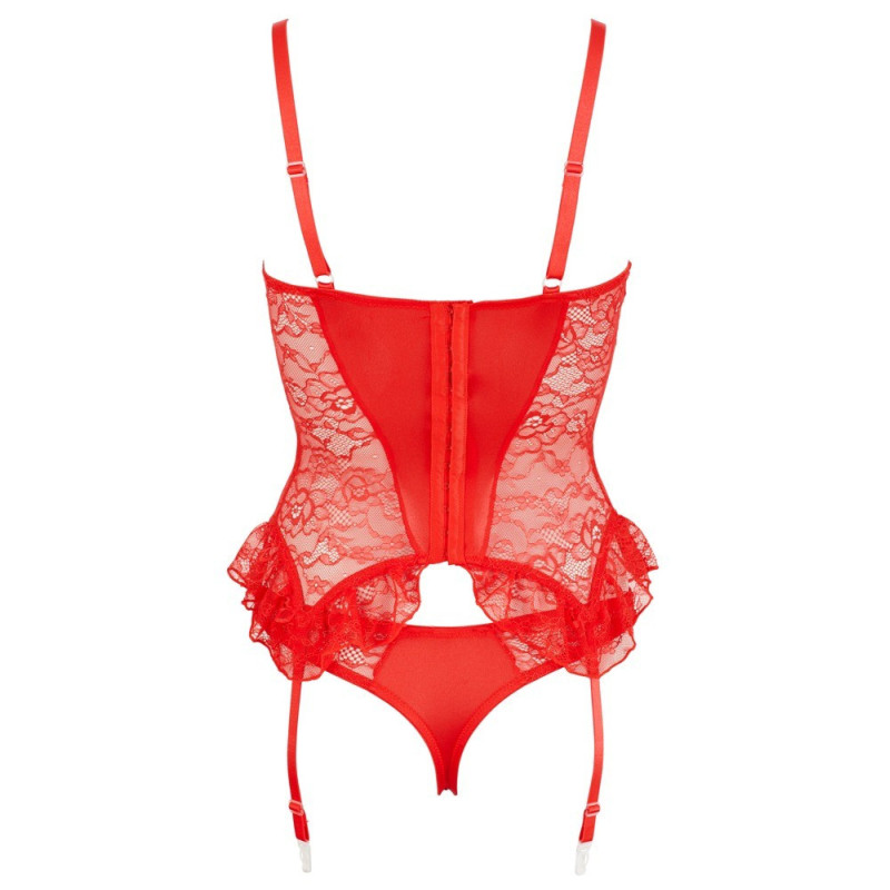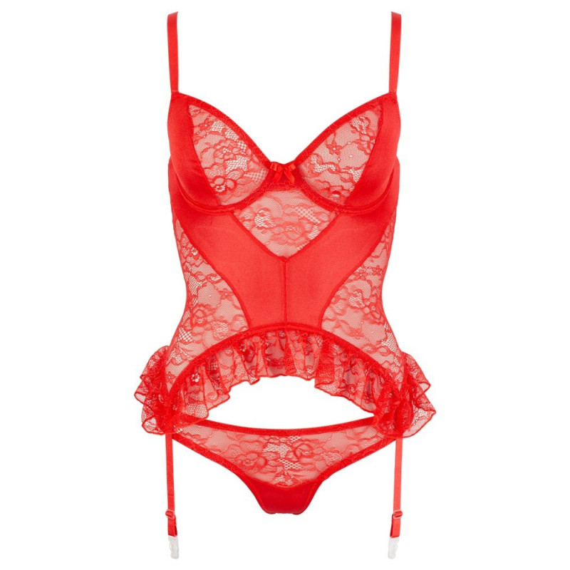 Questo sexy intimo rosso attira l'attenzione, non solo per il suo colore infuocato, ma soprattutto per i molti dettagli che rendono questo capo così speciale. Ciò include, soprattutto, il materiale, perché la camicia giarrettiera è davanti e sulle coppe del tempio in pizzo nobile, che è seducente e trasparente, e ha inserti fatti di tessuto opaco. Uno speciale eye-catcher è anche l'orlo con dolce ruches di pizzo, con il quale si può perfettamente nascondere qualsiasi curva. Nella parte posteriore è presente anche un inserto opaco, che incornicia piacevolmente la chiusura del gancio. Le quattro bretelle sul cinturino sono regolabili in lunghezza così come le cinghie. Inoltre, un Riostring corrispondente appartiene al set, che è fatto di pizzo e nel cavallo e sul retro di tessuto opaco. Quindi il tuo vestito da seduzione è completo!