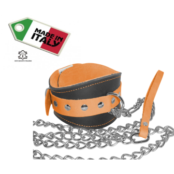 Collare in vera pelle (con interno scamosciato per un maggior comfort), guinzaglio con catena ritorta in ferro nichelato e laccio/polsino sempre in pelle. Prodotto artigianale 100% Made in Italy.