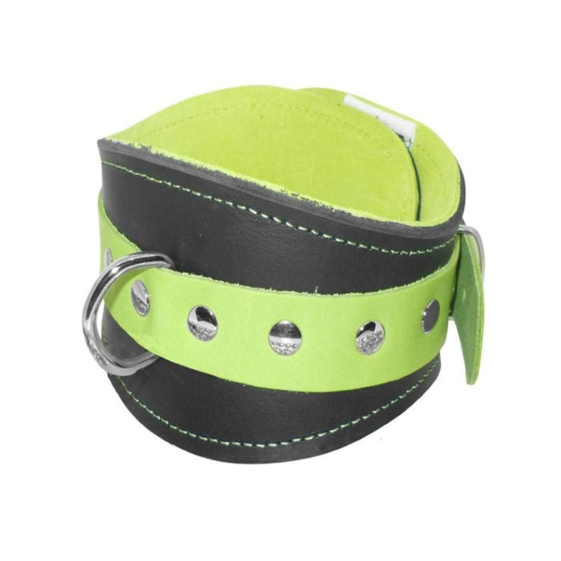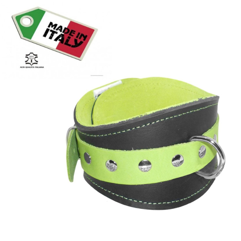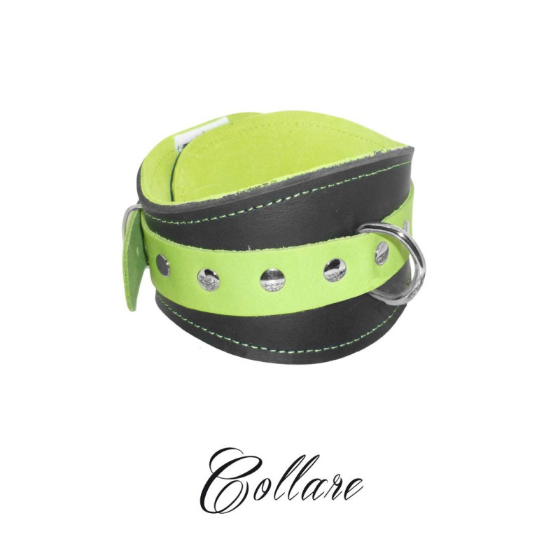 Collare sagomato in vera pelle (con interno scamosciato per un maggior comfort)con accessori in ferro nichelato. Prodotto artigianale 100% Made in Italy.