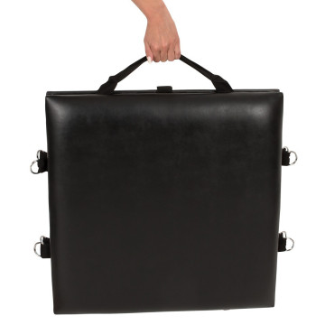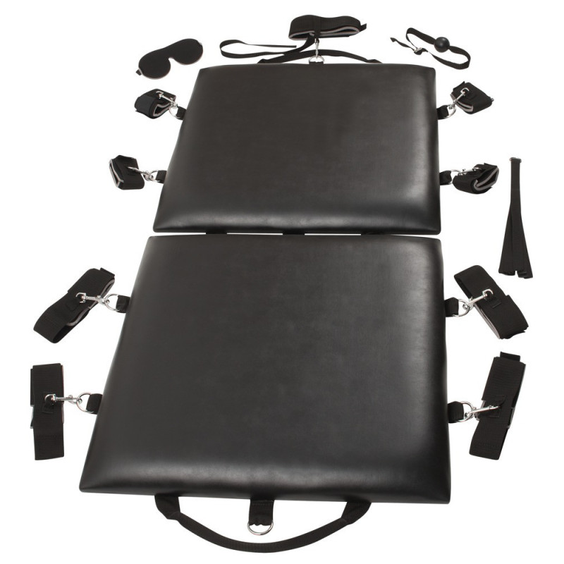 Con il Bondage Board ora puoi vivere le tue fantasie erotiche quasi ovunque. La tavola nera da bondage è pieghevole e occupa pochissimo spazio a casa. Il Bondage Board può essere facilmente trasportato con l'apposita maniglia per il trasporto. Quindi una punizione è possibile in qualsiasi luogo desiderato. Solo un po' di spazio è necessario per allestirlo. Il Bondage Board non lascia nulla a desiderare anche in termini di accessori: È dotato di 4 polsini per braccia e gambe e di 1 polsino per il collo ciascuno. Questi possono essere fissati in modo variabile alla tavola con l'aiuto di moschettoni. Il divertimento speciale è completato da una bavaglio in bocca, una frusta e una maschera per gli occhi. Per il desiderio al limite e le fantasie sessuali senza limiti!