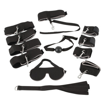 Piastra Fetlock con 2 piastre 60 x 60 cm (ripiegate di 120 cm), di cui 4 bracciali imbottiti (39 cm di lunghezza, 6 cm di larghezza), 4 bracciali imbottiti per le gambe (56 cm di lunghezza, 6 cm di larghezza), 1 polsino per il collo (5,5 cm di altezza) e 1 bavaglio a bocca (Ø 4,1 cm) con cinturino regolabile. La frusta convince con una lunghezza di 38 cm. La maschera per gli occhi è dotata di una cinghia elastica.
