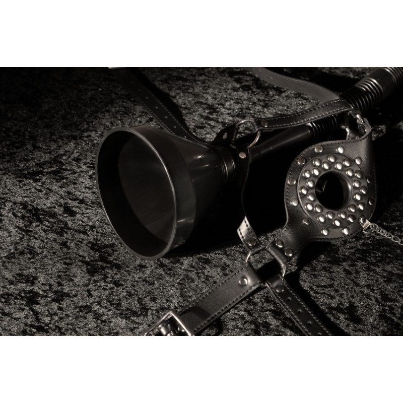 Sfida i tuoi limiti con questo fantastico imbracatura per la testa. All'imbracatura di cuoio resistente è collegato un imbuto giocoso, in modo da non poter sfuggire durante l'alimentazione o la bevuta. E quando è il momento di ripulire, rimuovi l'imbuto e lascia il tubo rivestito di gomma nella bocca del tuo sottomesso. Con quelle robuste fibbie metalliche puoi regolare facilmente la vestibilità per il massimo comfort e controllo. È il momento di lasciar libera la tua fantasia BDSM più selvaggia e portare il tuo piacere a un livello completamente nuovo.