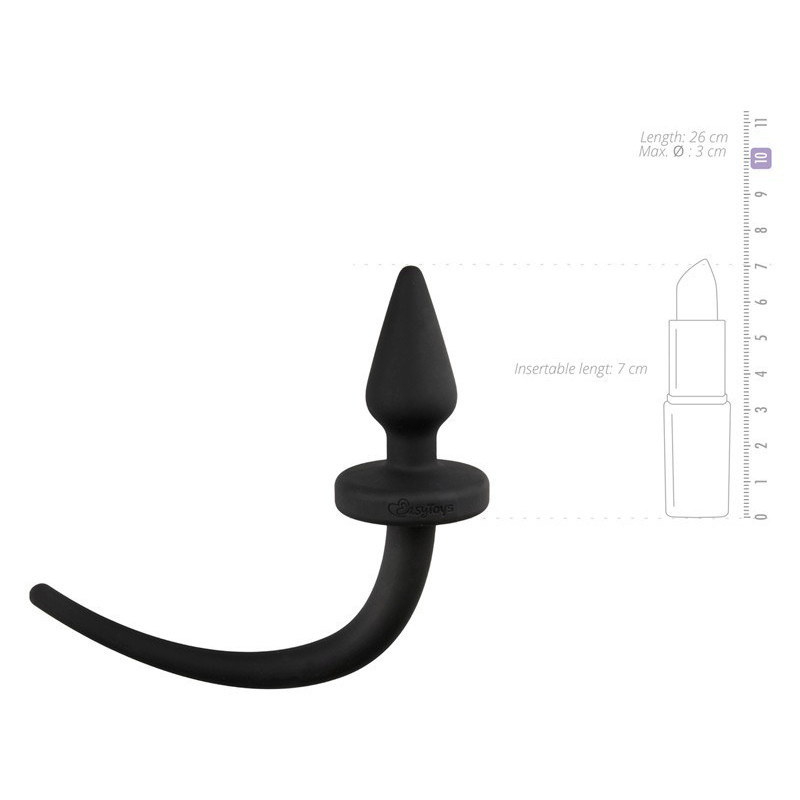 Plug anale nero con coda di cane della EasyToys Collection. Con questo plug anale, te e il tuo partner scodinzolerete di piacere! Il plug anale ha una parte inferiore piatta che ne rende l'utilizzo sicuro. Sulla parte piatta è fissata una coda di cane. Il plug anale ha una parte superiore appuntita che rende la penetrazione più facile. Ideale per un gioco di ruolo o per il pony!