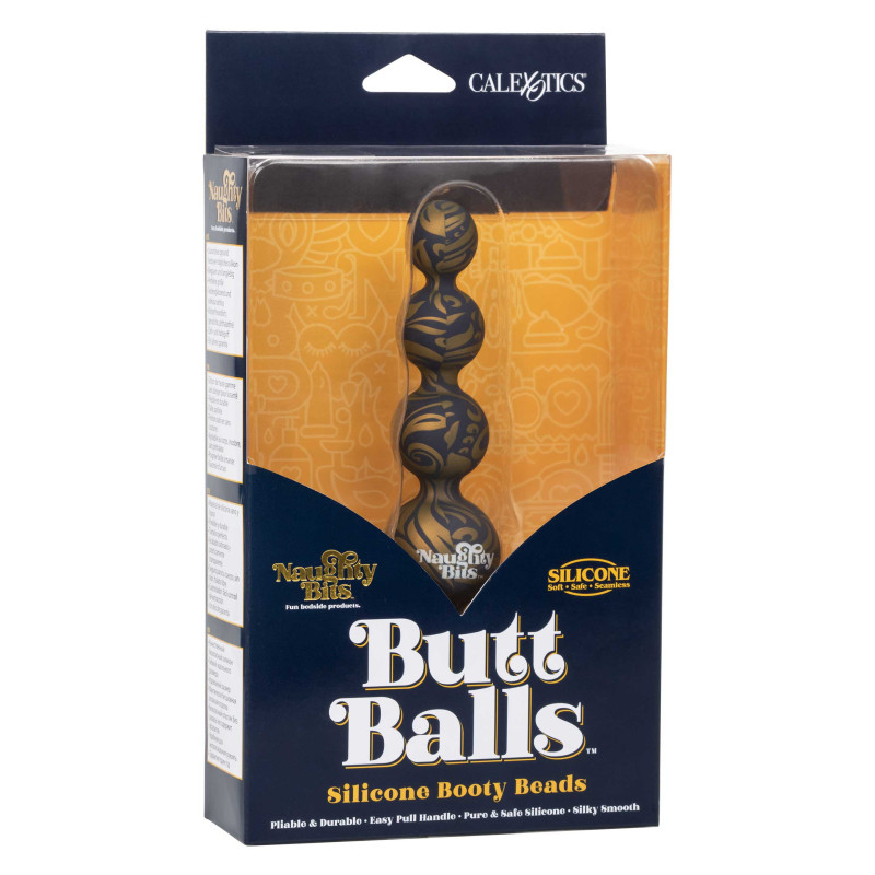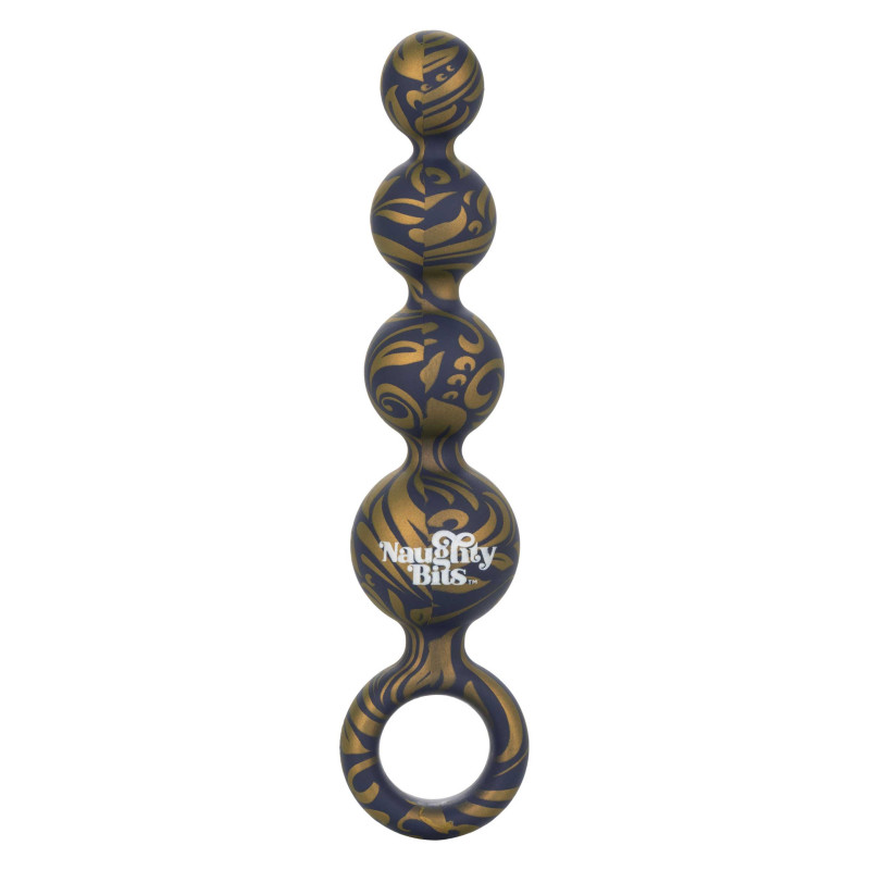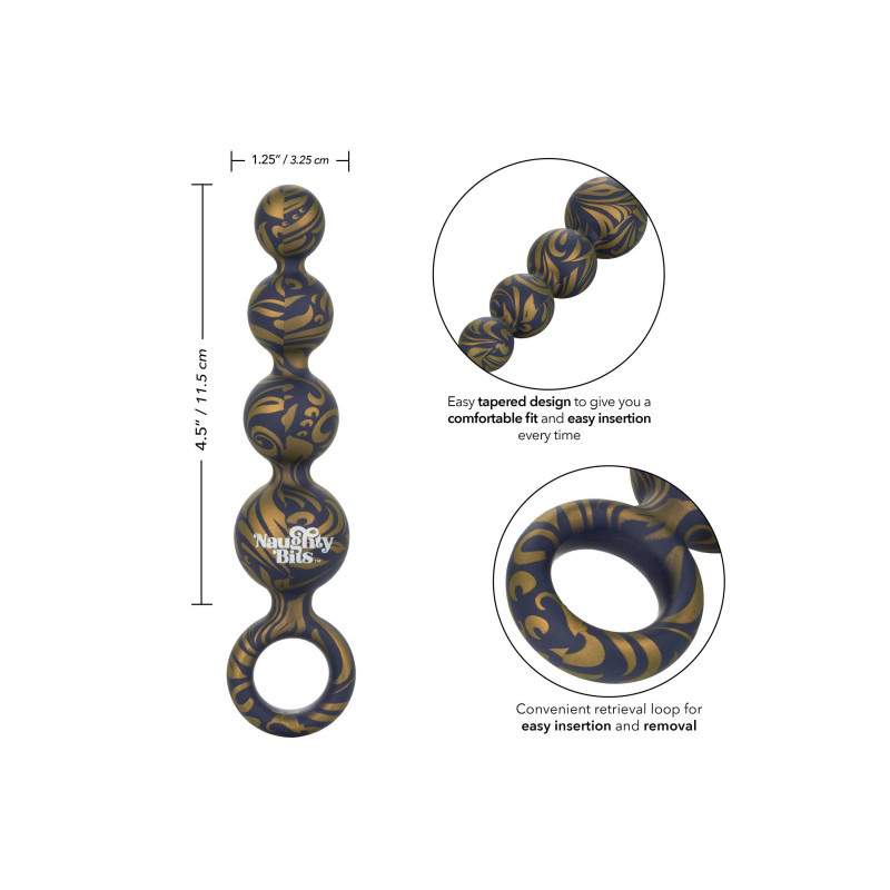 Il Naughty Bits™ Butt Balls™ Silicone Booty Beads è fatto per tutte le vostre esigenze anali con un silicone morbido, perline affusolate e un facile anello di recupero. Il piccolo plug ha un robusto anello di recupero a forma di O per un inserimento confortevole, una stimolazione eccitante e una rimozione sicura e delicata. Perfetto sia per i principianti che per gli esperti di erotismo, l'asta affusolata aumenta in circonferenza per intensificare il piacere. La collezione Naughty Bits™ è fatta per risaltare in qualsiasi comodino con design accattivanti e caratteristiche orgasmiche. Il silicone ultra felpato e il motivo marmorizzato dorato di questa splendida sonda anale faranno sorridere anche l'amante più elegante prima e dopo.