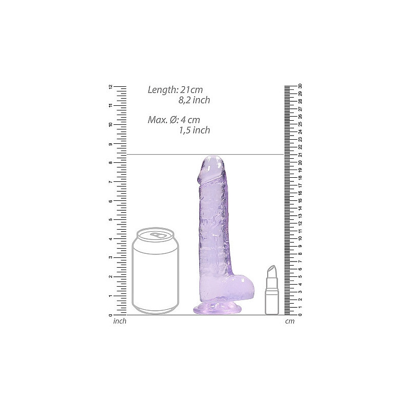 Questo modello con testicoli misura 21 cm (8.3") di lunghezza compresa la ventosa, ha una lunghezza inseribile di 16 cm (6.3") e ha una circonferenza di 4 cm (1.6")
