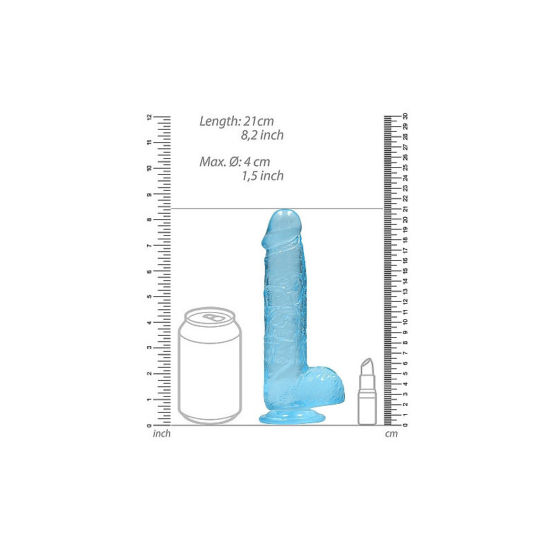 Questo modello con testicoli misura 21 cm (8.3") di lunghezza compresa la ventosa, ha una lunghezza inseribile di 16 cm (6.3") e ha una circonferenza di 4 cm (1.6")