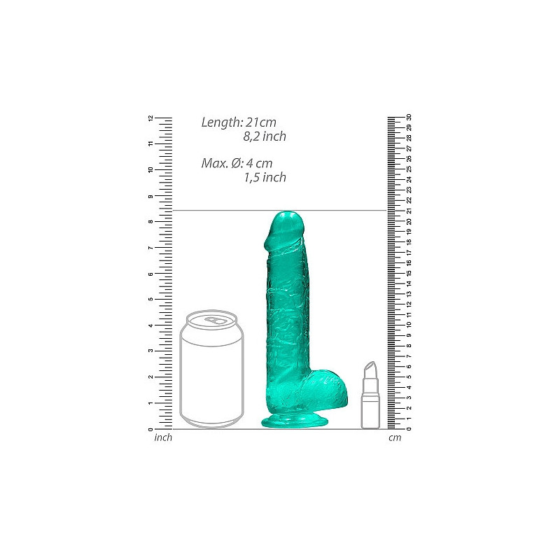Questo modello con testicoli misura 21 cm (8.3") di lunghezza compresa la ventosa, ha una lunghezza inseribile di 16 cm (6.3") e ha una circonferenza di 4 cm (1.6")