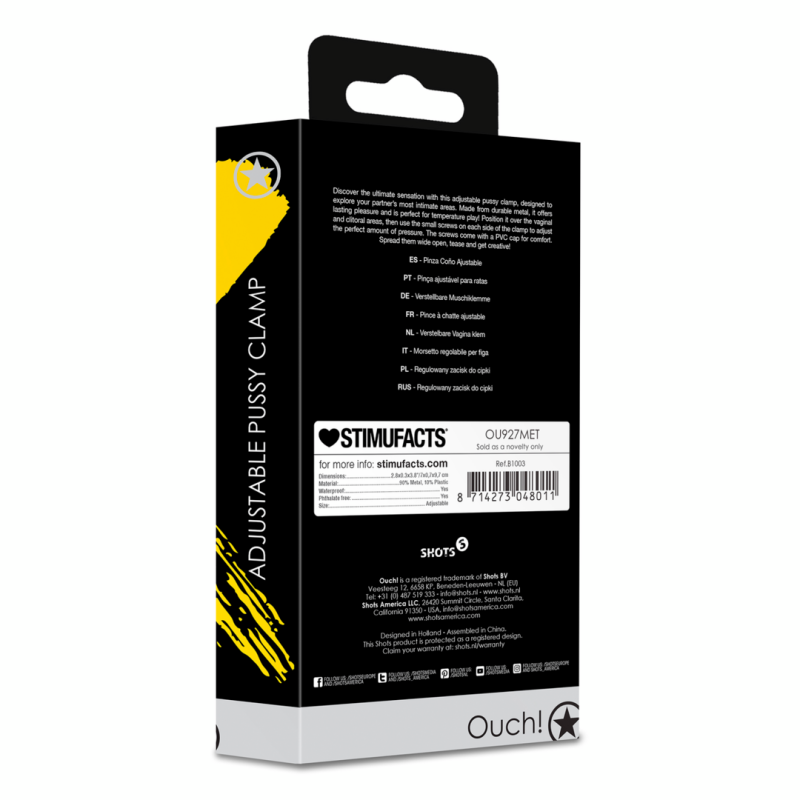 Scopri la sensazione definitiva con questa pinza regolabile per la figa, progettata per esplorare le zone più intime del tuo partner. Realizzata in metallo resistente, offre un piacere duraturo ed è perfetta per i giochi di temperatura! Posizionala sulle aree vaginali e clitoridee, quindi usa le piccole viti su ciascun lato della pinza per regolare la quantità perfetta di pressione. Le viti sono dotate di un cappuccio in PVC per il massimo comfort. Aprile completamente, stuzzica e diventa creativo!