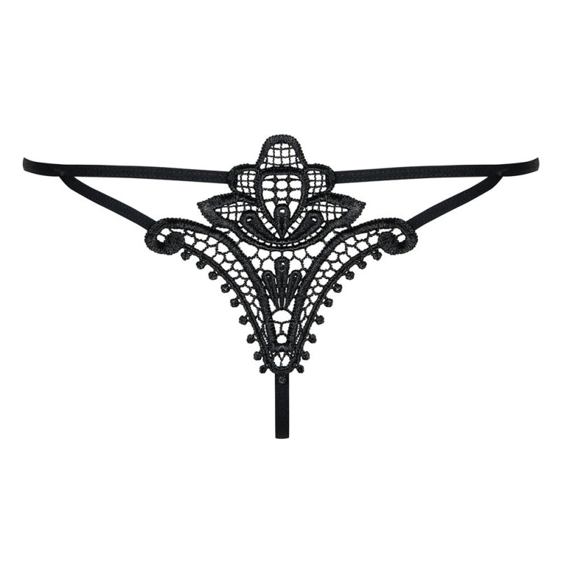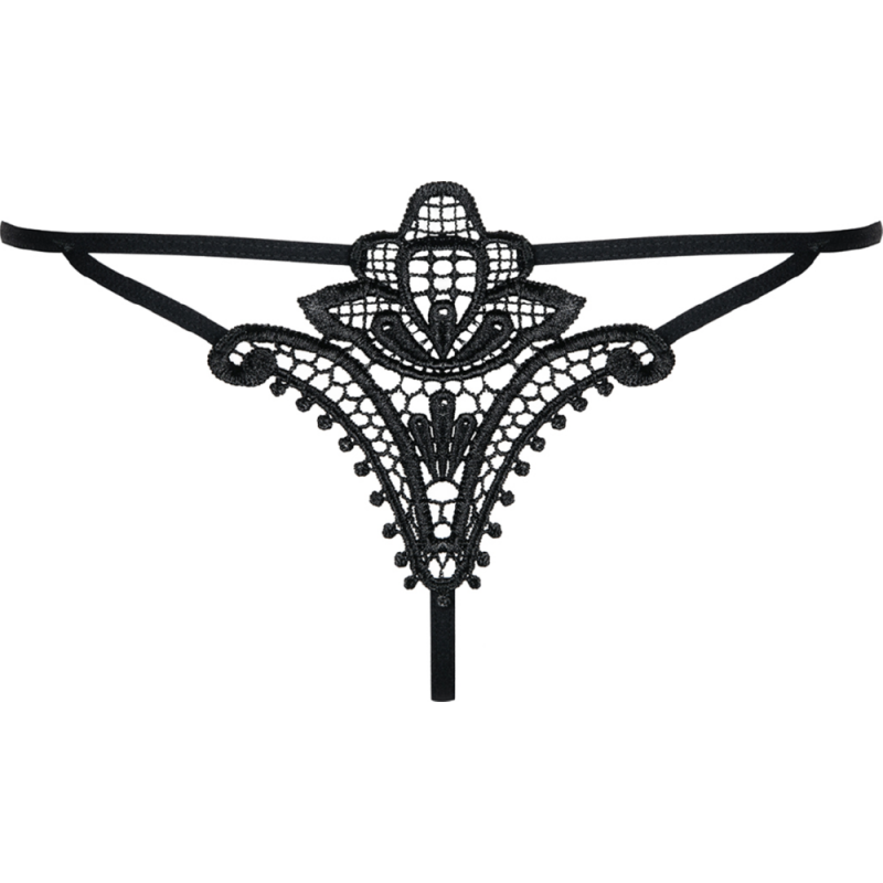 String con un fronte semplice, elastici sul lato e ricamo a filigrana sul retro. Nero. 94% poliammide, 6% spandex.