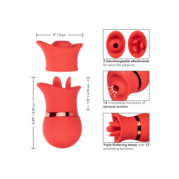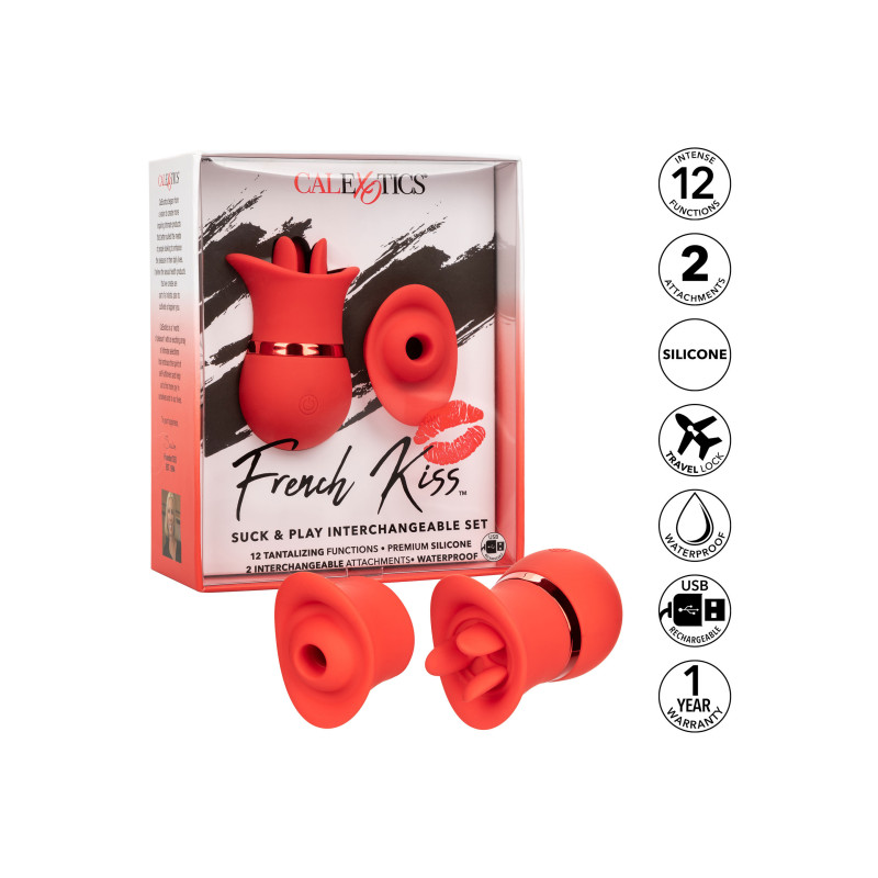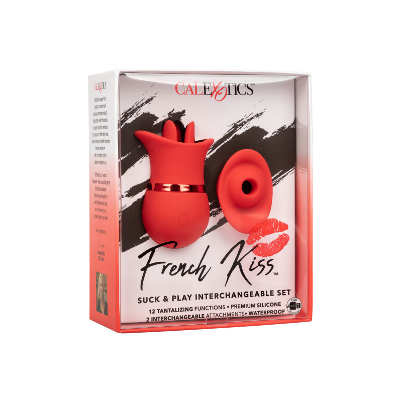 Due volte il piacere, oh la la! Il sensuale set intercambiabile French Kiss Suck & Play sa cosa vi serve con 2 accessori intercambiabili con 12 funzioni di vibrazione o 12 funzioni di aspirazione. La paletta a contatto completo e lo svolazzante stuzzica lingua triplo sono stati realizzati per adattarsi perfettamente ai vostri punti di piacere più intimi con 12 funzioni intense. Inserite l'encaser sensualmente sagomato e godetevi 12 funzioni di aspirazione o un vero e proprio bacio alla francese con 12 funzioni di azione tremolante. Il morbido silicone e il corpo sensualmente sagomato consentono di offrire un piacere mirato da quasi tutte le angolazioni. Utilizzate il pulsante easy-touch per controllare fino a 50 minuti di piacere. Ricaricate il vostro piacere in solo 1 ora con il cavo USB in dotazione nella porta di ricarica autosigillante del massaggiatore. Le dimensioni discrete del mini massaggiatore e il pulsante di blocco da viaggio lo rendono un compagno di viaggio perfetto, che vi permetterà di abbracciare il piacere irradiato ovunque vi portino le vostre fantasie.