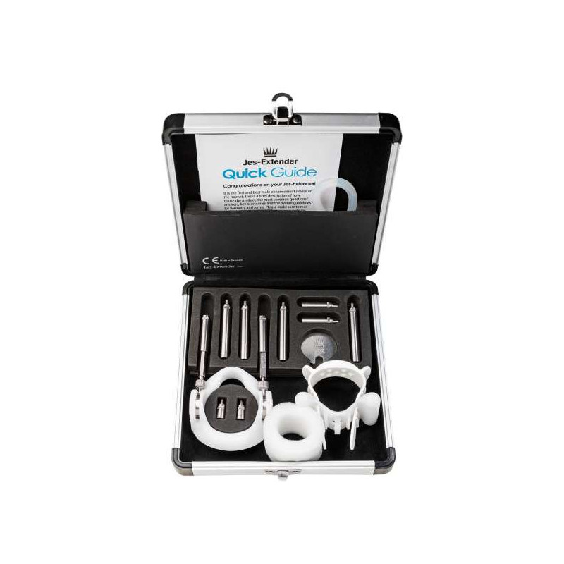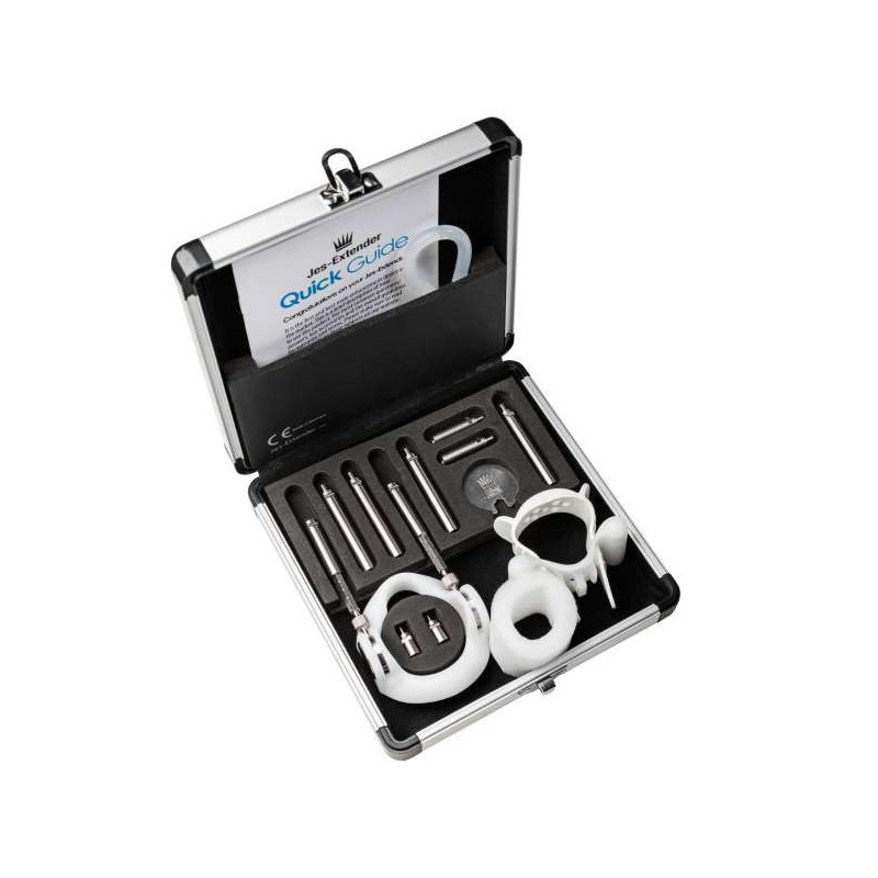 Per l'ingrandimento permanente del pene! Espansore per l'ingrandimento del pene indolore e cintura di comfort. Adatto per una lunghezza del pene di 5-24 cm e funziona con una forza di 900-1500 g. Con video esplicativo online. Compresa la custodia e 2 anni di garanzia. 4 x barre di espansione 5 cm, 2 x barre di espansione 2,5 cm, 2 x barre di espansione 1,25 cm. Ottone, Nitina, POM.