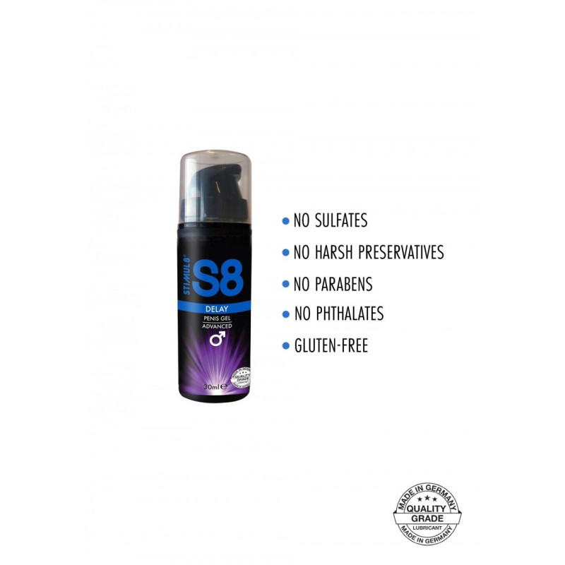 Durate più a lungo nel vostro amore facendo con la qualità S8 Delay Gel! Questa formula premium contiene ingredienti dermatologicamente testati che aiutano a ritardare il climax senza perdita di sensibilità, consentendo sessioni più lunghe di gioco intimo. Il S8 Delay Gel è privo di glicerina, privo di solfati, privo di parabeni, privo di ftalati e non contiene conservanti aggressivi, che lo rendono una scelta "naturale" e affidabile nel benessere intimo. Ingredienti : AQUA(WATER, GLYCERIN, PENTYLENE GLYCOL, LAURETH-9, CARBOMER, SODIUM HYDROXIDE, MENTHA SPICATA CRISPA HERB OIL