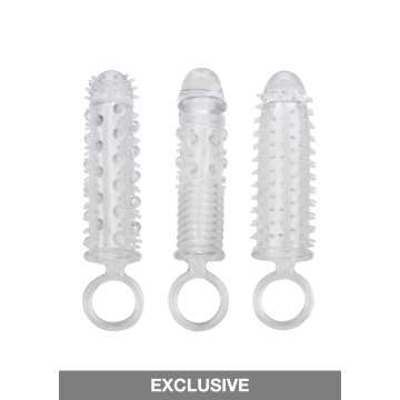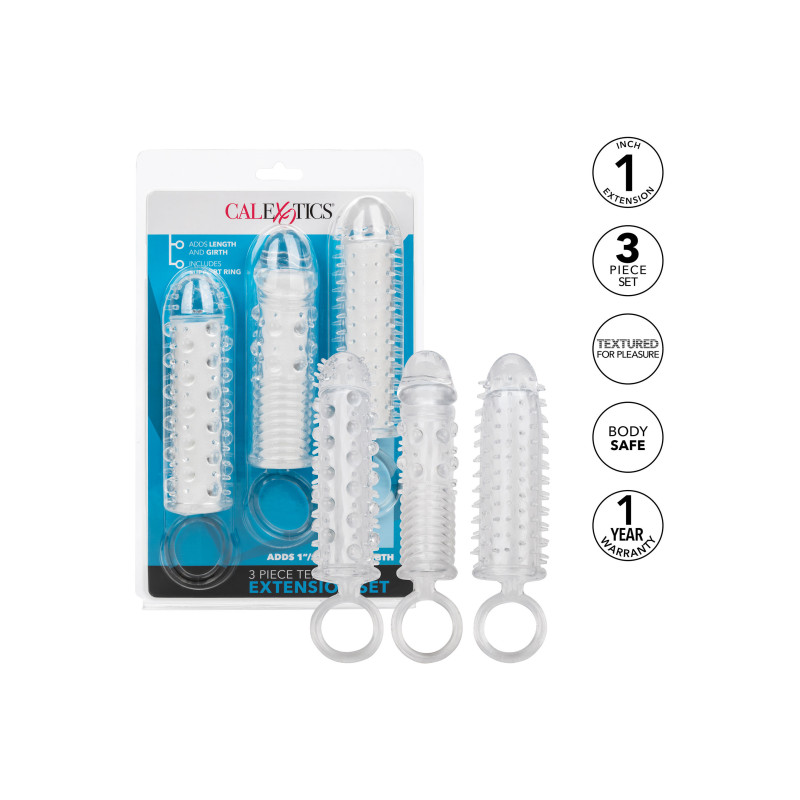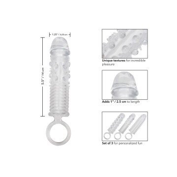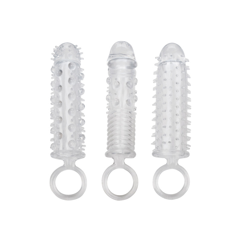 Il kit di estensione in 3 pezzi è un set di 3 guaine di estensione strette e ravvicinate con una struttura a coste all'interno e all'esterno per una stimolazione intensa. Queste guaine per l'ingrandimento del pene si avvolgono strettamente per aumentare la circonferenza, la lunghezza e il piacere esplosivo per tutti i partecipanti. L'enhancer erotico è dotato di una solida testa del pene accentuata e di una punta del serbatoio che offre un piacere extra di 1". Mentre voi eccitate il vostro amante con una maggiore circonferenza e stimolanti solleticatori, il potente supporto all'erezione e la camera testurizzata dello stimolatore erotico garantiscono risultati esplosivi per entrambi. La camera testurizzata e l'anello di sostegno forniscono una maggiore stimolazione e un potente supporto. Avvolgete il vostro strumento di piacere in questa guaina super elastica per aumentare facilmente la resistenza, la stimolazione e il piacere dell'orgasmo. L'enhancer flessibile è realizzato in TPE igienicamente superiore. Questo materiale sicuro per il corpo non è profumato e non contiene ftalati, per rendere felici e sani i vostri punti più sensibili.