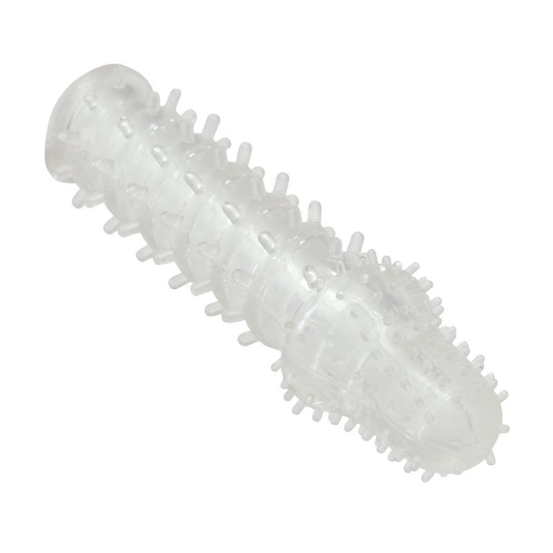 Guaina fallica trasparente in TPE con setole e protuberanze per la stimolazione delle pareti interne vaginali. Priva di ftalati.
