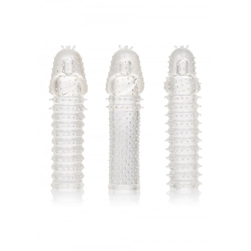 kit composto da 3 guaine falliche indossabili . Le guaine potranno essere indossate sul pene oppure su un fallo o vibratore .