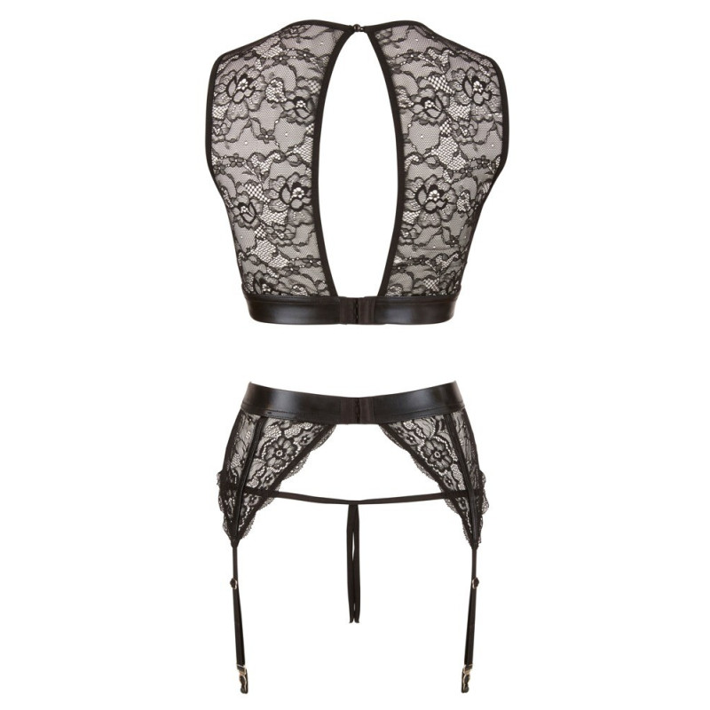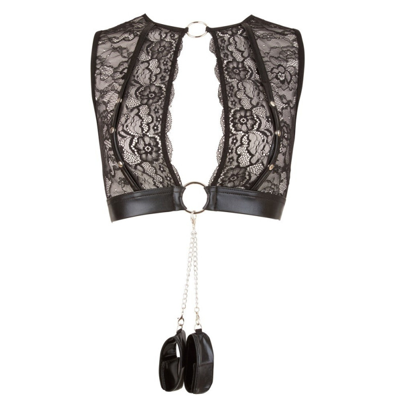 Set composto da reggiseno con bottoni automatici sopra il seno, reggicalze, slip aperto (crotchless) e manette con chiusura a strappo e moschettoni.C'è un piccolo bottone nella parte posteriore del collo. Pizzo 90% poliammide, 10% elastan; inserti e stringhe 92% poliestere, 8% elastan.