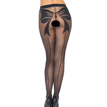 Collant nero con dettaglio linea sul retro e un grande fiocco. Ha un'apertura sexy e provocante
