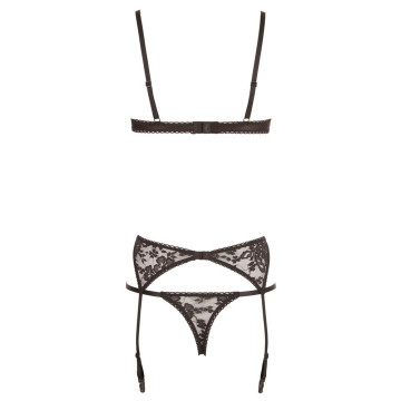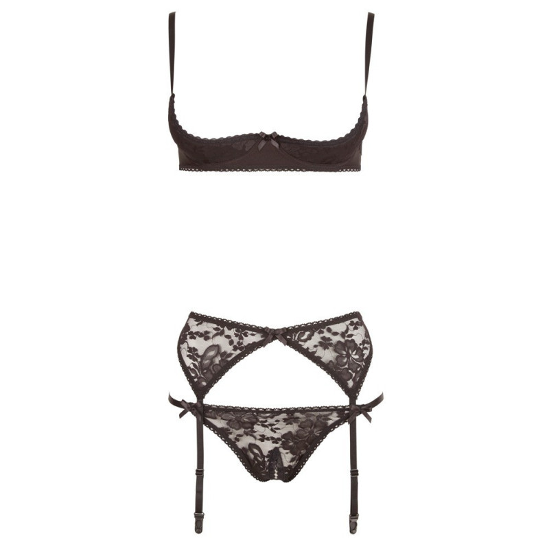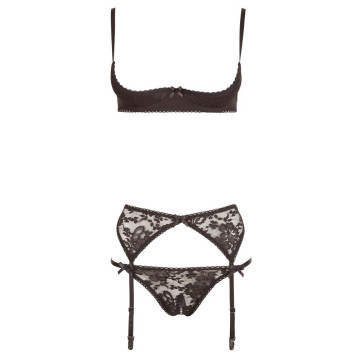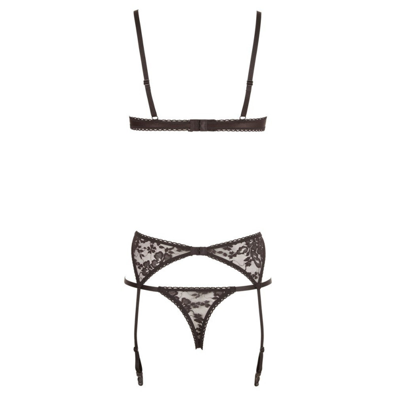 Trio Femme fatale! Sollevando, ribaltando la cintura inguinale e la bretella in un set. Tutte e tre le parti in pizzo nero ed elastico. Sollevare con coppe per cinturino leggermente imbottite, che si riaccendono in modo eccitante nel cavallo.