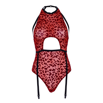 Body sexy a giarrettiera in velluto leopardata velato con apertura sul retro